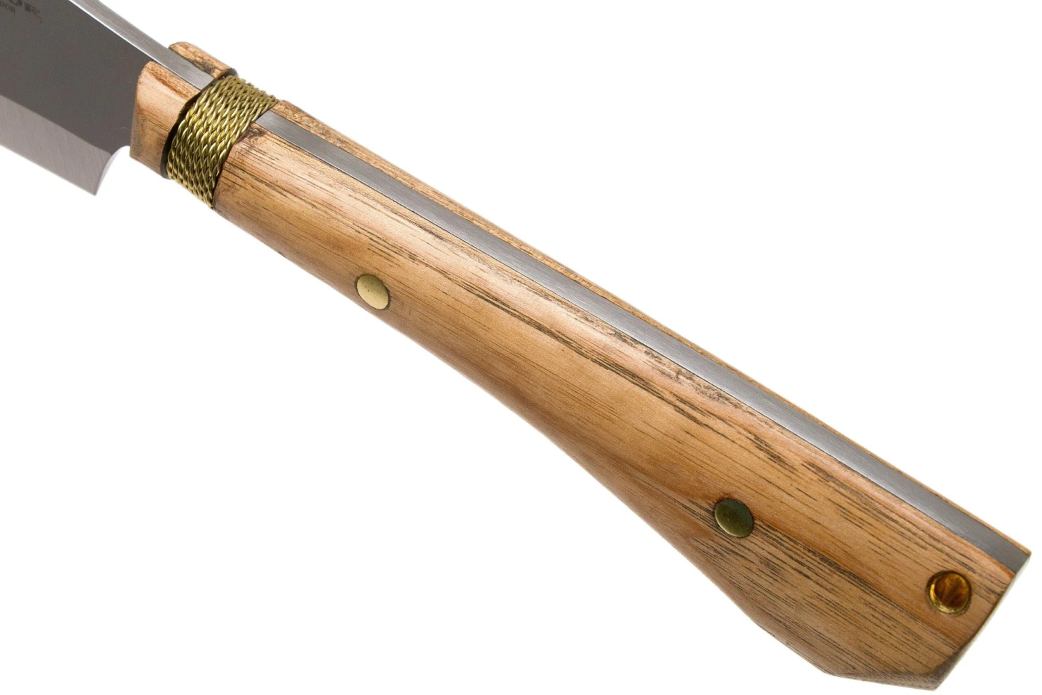 El Condor Batonata Chopper CTK2013-10HC es un machete de gran tamaño, diseñado por Joe Flowers. Con un grosor de hoja de 5 mm es un cuchillo realmente grande. Se diseñó para partir madera. Por lo tanto, es especialmente apropiado que el mango esté hecho de madera de nogal americano. Es un tipo de madera que se conoce por su uso en los mangos de las hachas. Así que a prueba de golpes. Al igual que la hoja gruesa. Las flores se inspiraron para este diseño en los cuchillos nata japoneses. De ahí el nombre: Batonata. Una Nata con la que hacer batoning.