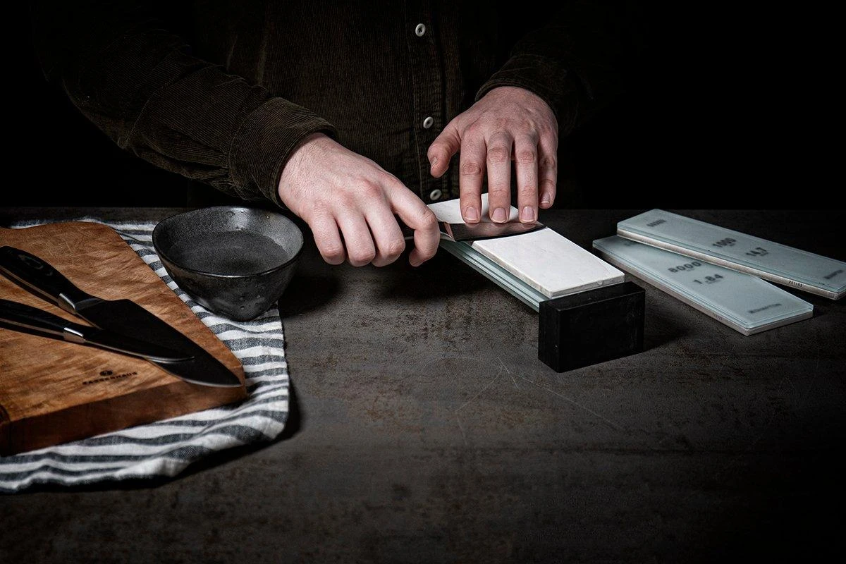Utiliza este juego de piedras de afilar Shapton Glass Stone para afilar tus cuchillos ya afilados y asegurarte de que se mantienen afilados. La piedra de grano 500 es perfecta para afilar cuchillos sin filo. La piedra grano 2000 te ayuda a afilar cuchillos que ya están relativamente afilados. Con el grano 16000 puedes eliminar todas las irregularidades y arañazos.