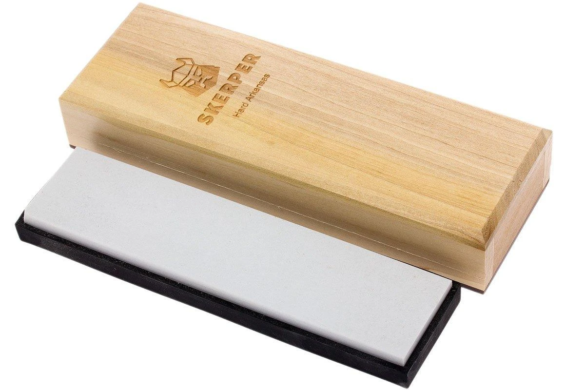 La piedra de afilar natural Skerper Hard Arkansas es una buena opción para empezar si tus cuchillos y herramientas están en buen estado. Es decir, si no tienen virutas ni rodillos en el filo, pero no están suficientemente afilados. La piedra Hard Arkansas es comparable a una piedra sintética americana de grano 800-1000. El acabado de esta piedra es bastante fino y suficiente para un acabado de filo dentado. Es lo suficientemente larga y ancha para todas las tareas de afilado, desde cuchillos de cocina y cuchillos de exterior hasta diversas herramientas para trabajar la madera y navajas. Estas piedras están disponibles en 5 granos diferentes. Cada piedra viene en su propia caja de madera para su almacenamiento y transporte.
